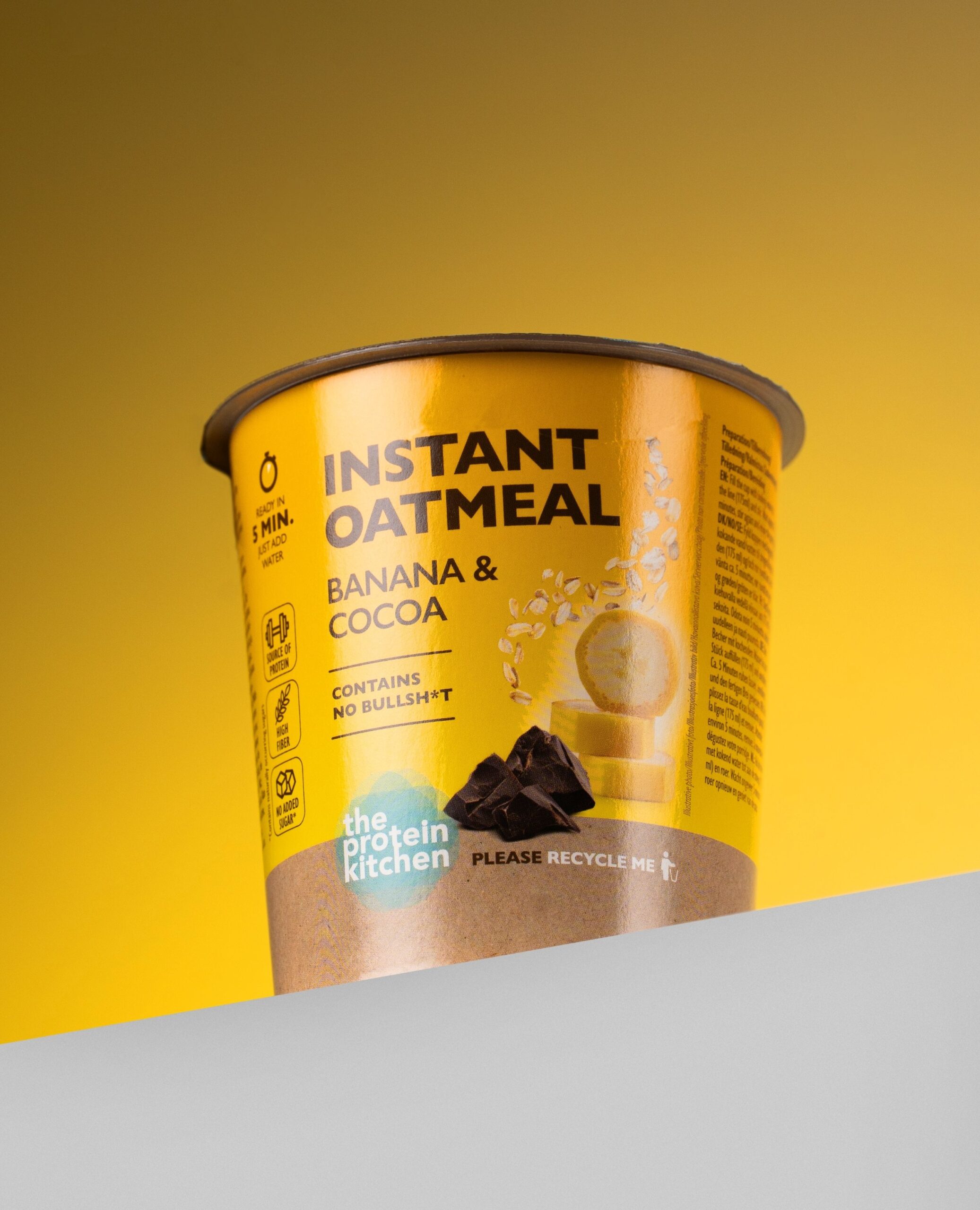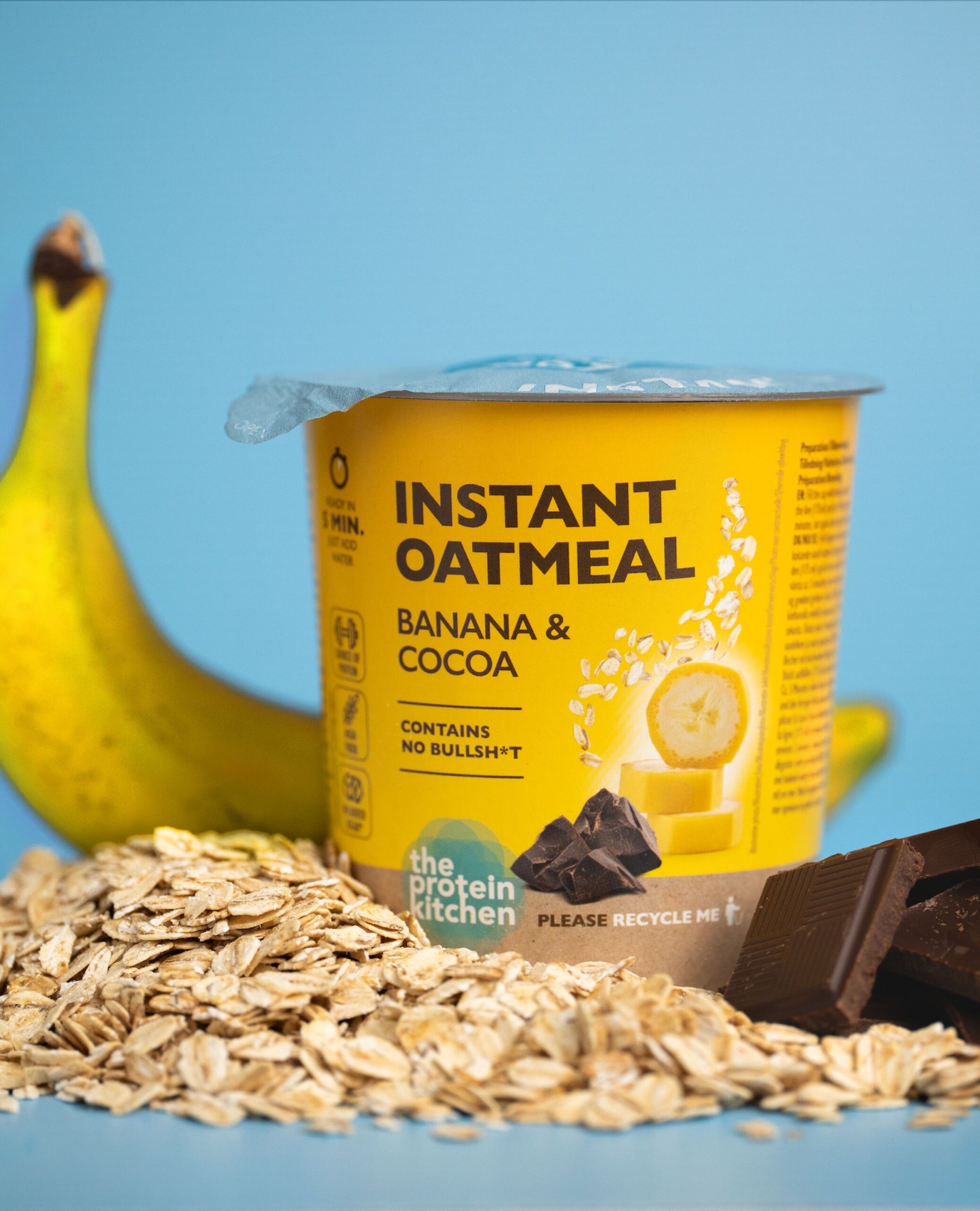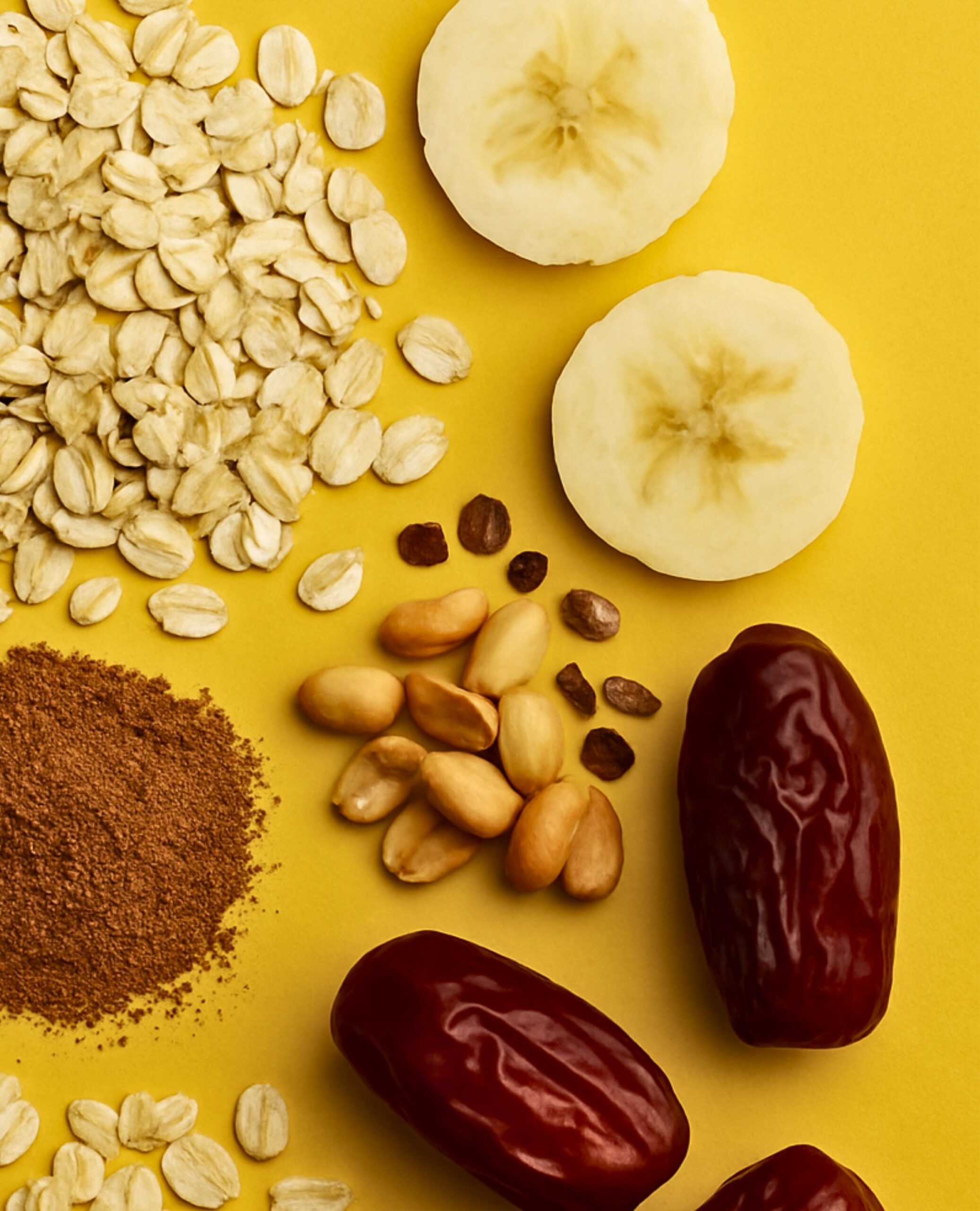 Ingredienser: Grovvalsede HAVREGRYN 75%, dadelpulver, tørrede bananstykker 6%, kakaonibs 2%, fedtfattig kakao 2%, carobpulver, ristede PEANUT-stykker, havsalt, naturlige aromaer.